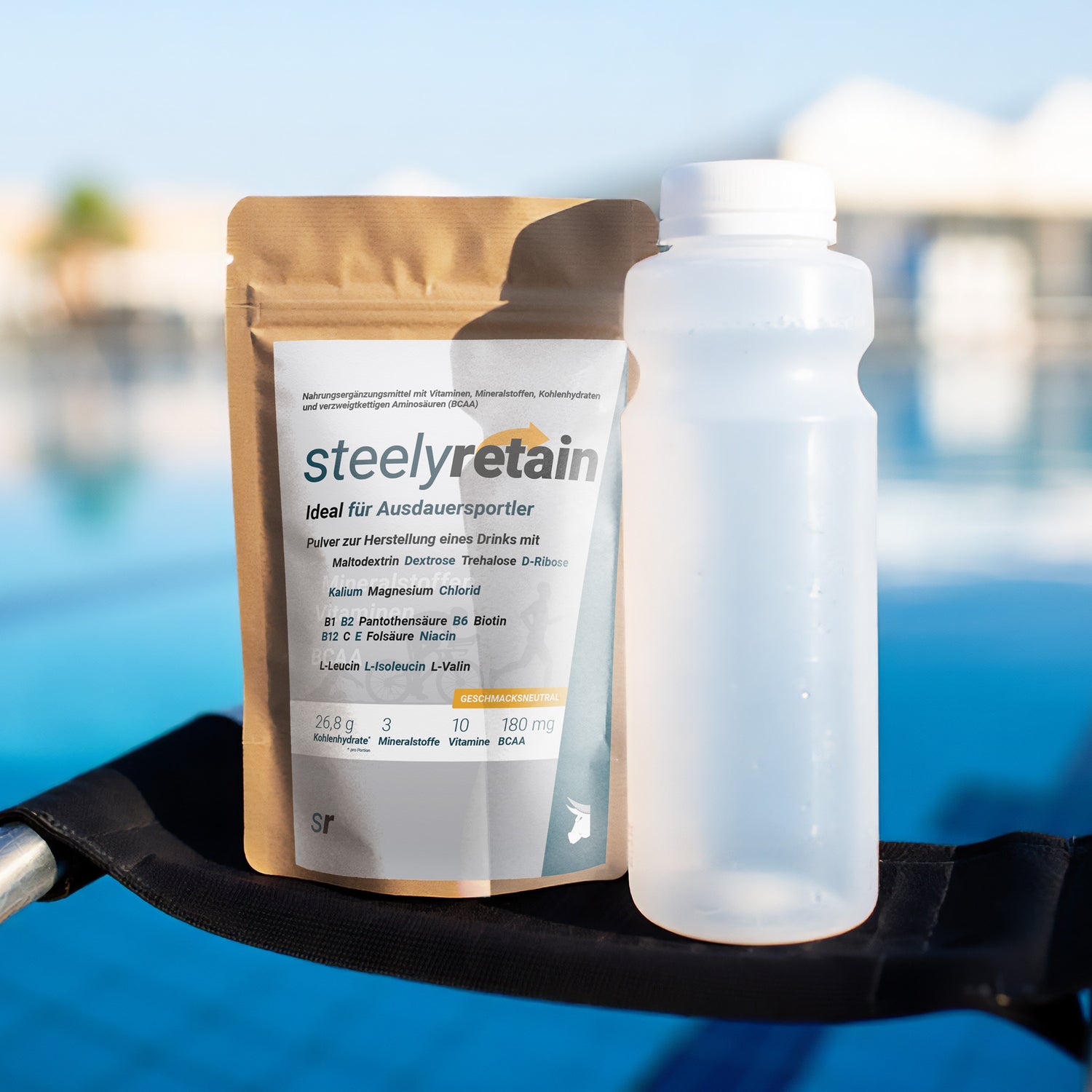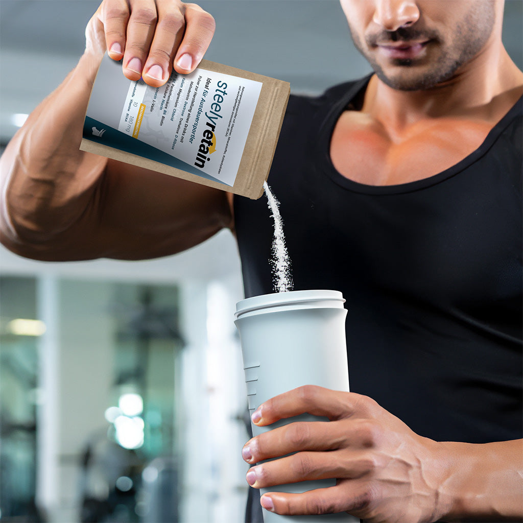 Du kannst SteelyRetain pur trinken (leicht süßlicher Geschmack) oder nach Belieben mit Saft oder Getränkekonzentraten (z. B. AsVita Fresh Mix) kombinieren – so entsteht dein individueller Trainingsdrink mit Geschmack.