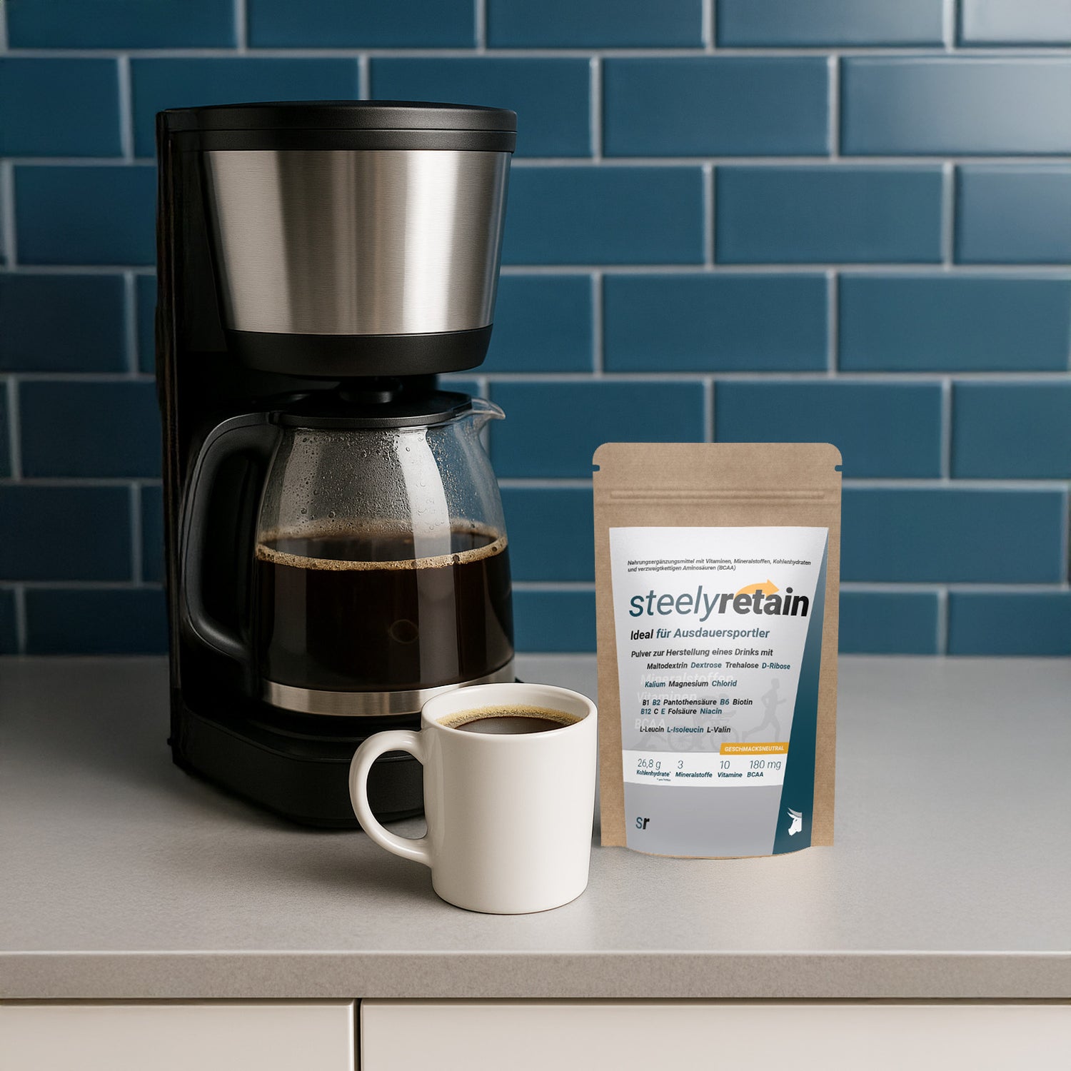 Ob im Büro, auf der Piste oder zwischen zwei Trainingseinheiten: Ein 30 g-Beutel SteelyRetain passt in jede Tasche und lässt sich sekundenschnell in nahezu jedem Getränk lösen.