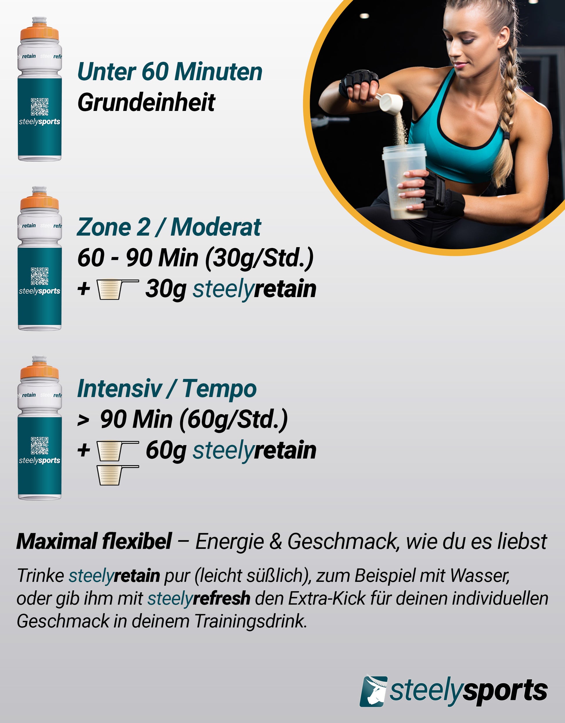SteelyRetain ist geschmacksneutral, frei von Fruktose, Laktose und Gluten und lässt sich nach Wunsch mit Saft oder Getränkekonzentrat wie dem SteelyRefresh kombinieren – für mehr Abwechslung im Geschmack.