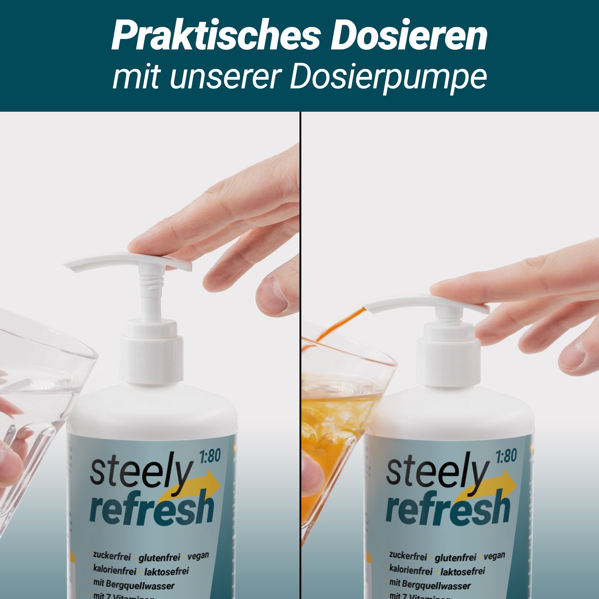 SteelyRetain ist geschmacksneutral, frei von Fruktose, Laktose und Gluten und lässt sich nach Wunsch mit Saft oder Getränkekonzentrat wie dem SteelyRefresh kombinieren – für mehr Abwechslung im Geschmack.