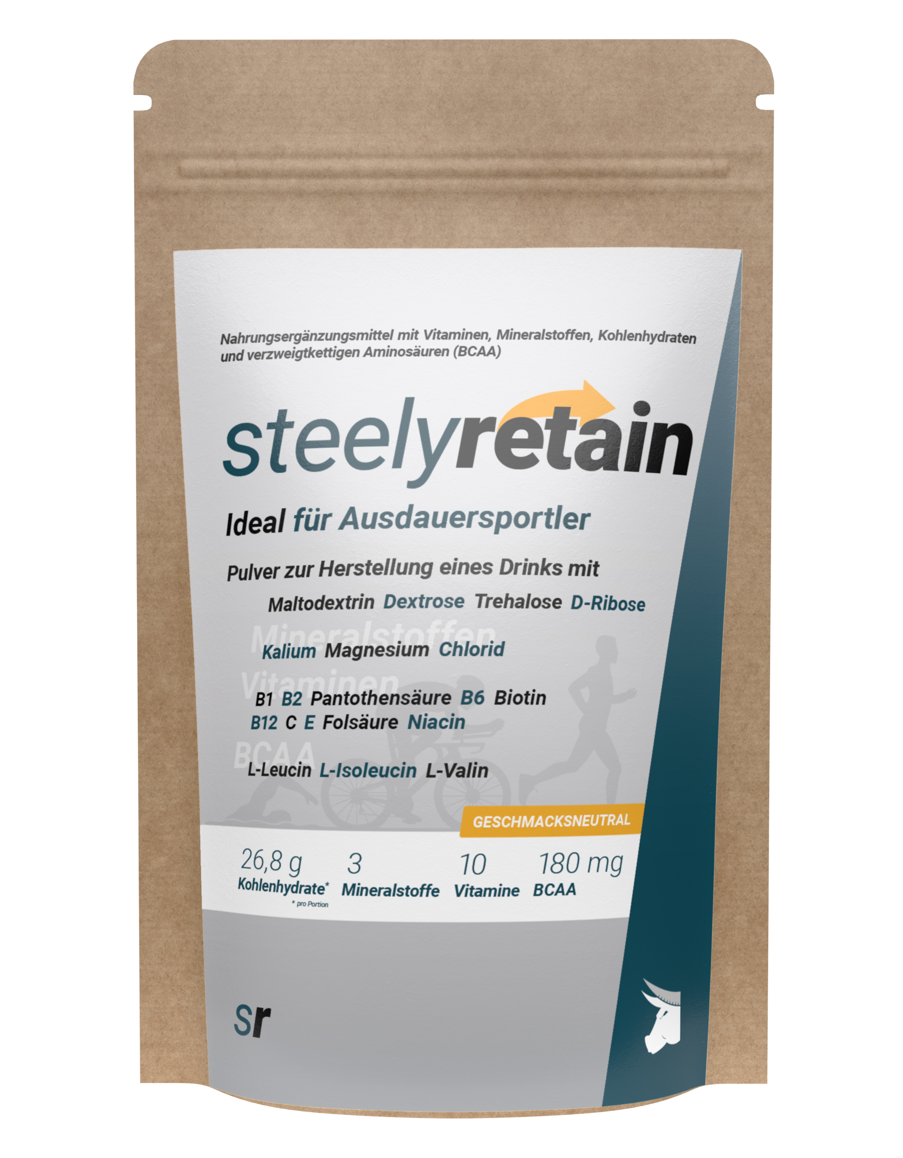 SteelyRetain kombiniert gezielt verschiedene Kohlenhydratquellen (Maltodextrin, Dextrose, Trehalose, D-Ribose) für eine schnelle UND gleichmäßige Energieversorgung. Zusätzlich enthält es BCAA, Vitamine und Mineralstoffe – das decken klassische isotonische Getränke meist nicht ab. Es ist außerdem geschmacksneutral, was dir volle Flexibilität bei der Zubereitung gibt – z. B. mit Wasser oder Getränkekonzentrat wie dem AsVita Fresh Mix.