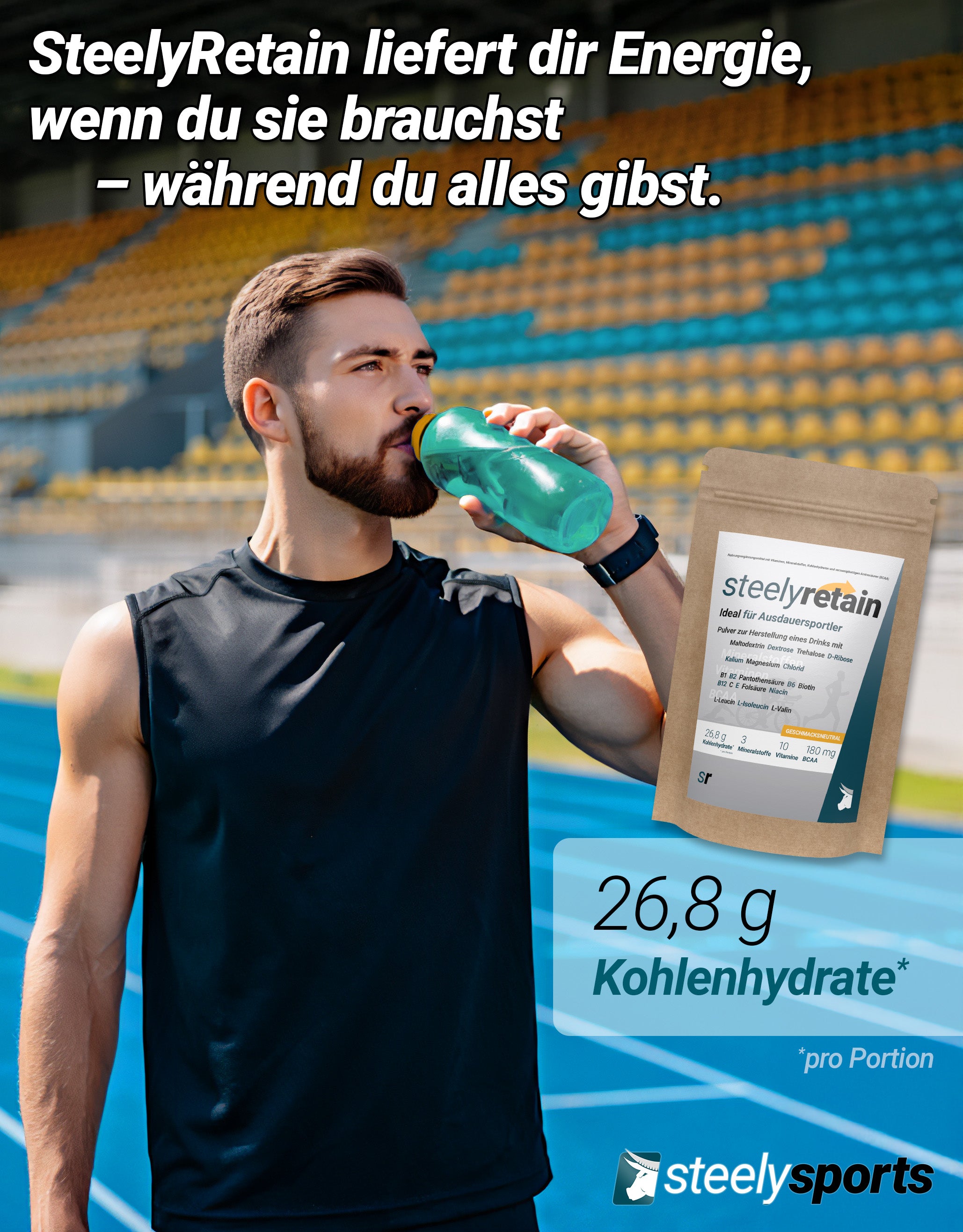 - Die Kohlenhydrate in SteelyRetain helfen, deine Glykogenspeicher wieder aufzufüllen,